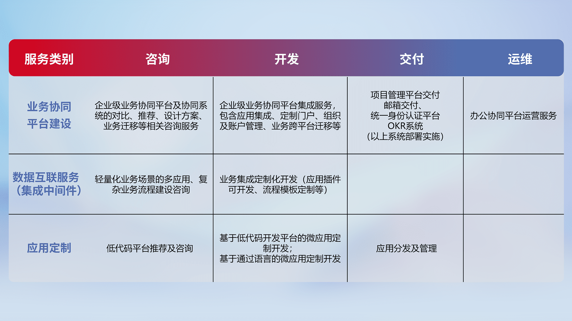 针对钉钉、、、、企微、、、、IDaas等平台级产品提供产品的规划、、、方案、、、、交付、、、、定制化开发等服务,,,实现如统一协同办公、、智能客户服务、、、、混合会议管理、、、智能数据查询、、、等业务场景,,实现数字化转型。。。。